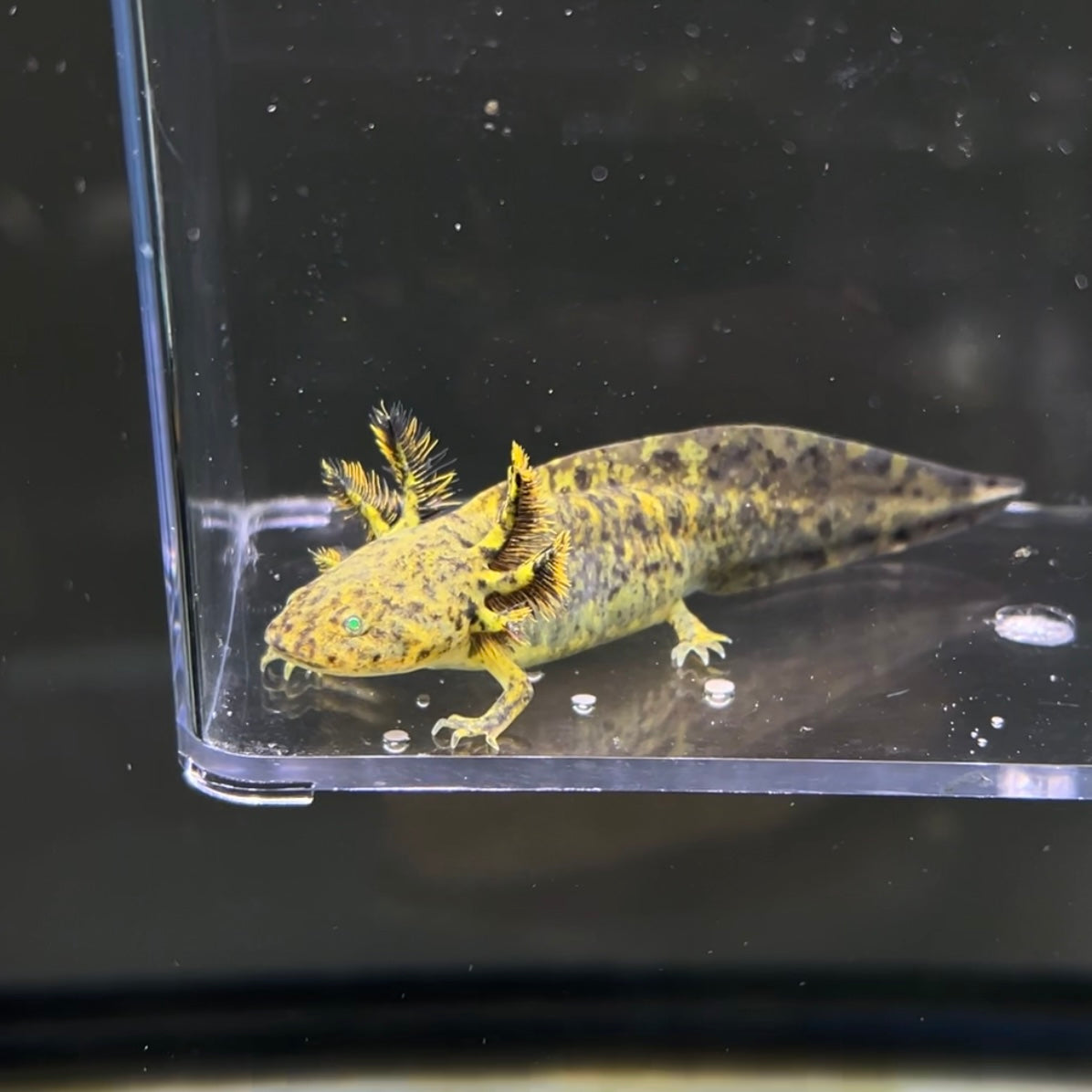The GFP Wild Type axolotl is a bit more eye-catching than most thanks to the green fluorescent protein (GFP) gene that it carries in its DNA. This gene gives GFP axolotls a bright green cast that glows under certain types of light.